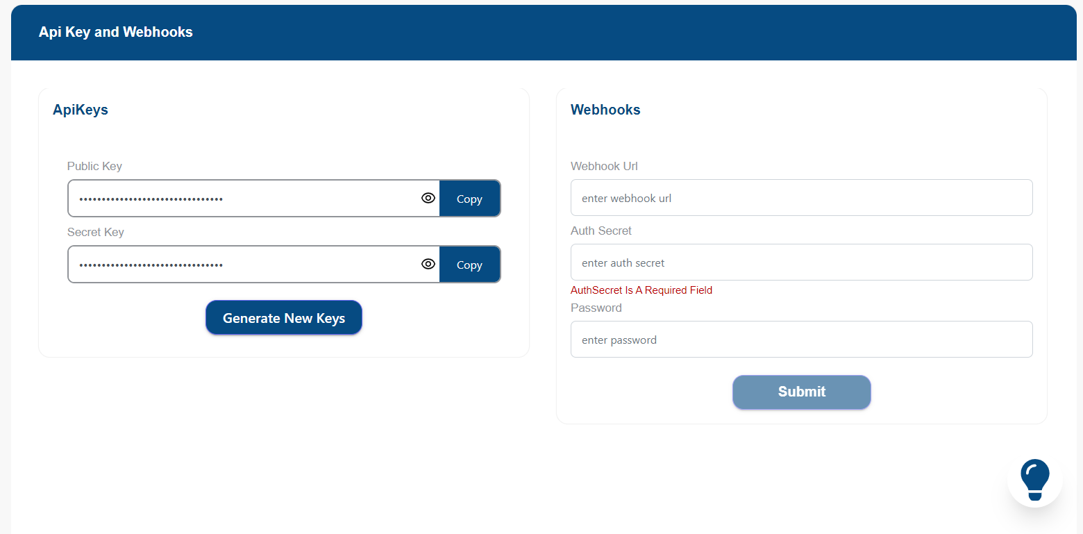 The API keys/webhook menu provides merchants with access to manage their API keys and configure webhook settings. Merchants can generate unique API keys, view and edit existing API keys associated with their account, and regenerate API keys if they suspect that the keys have been compromised