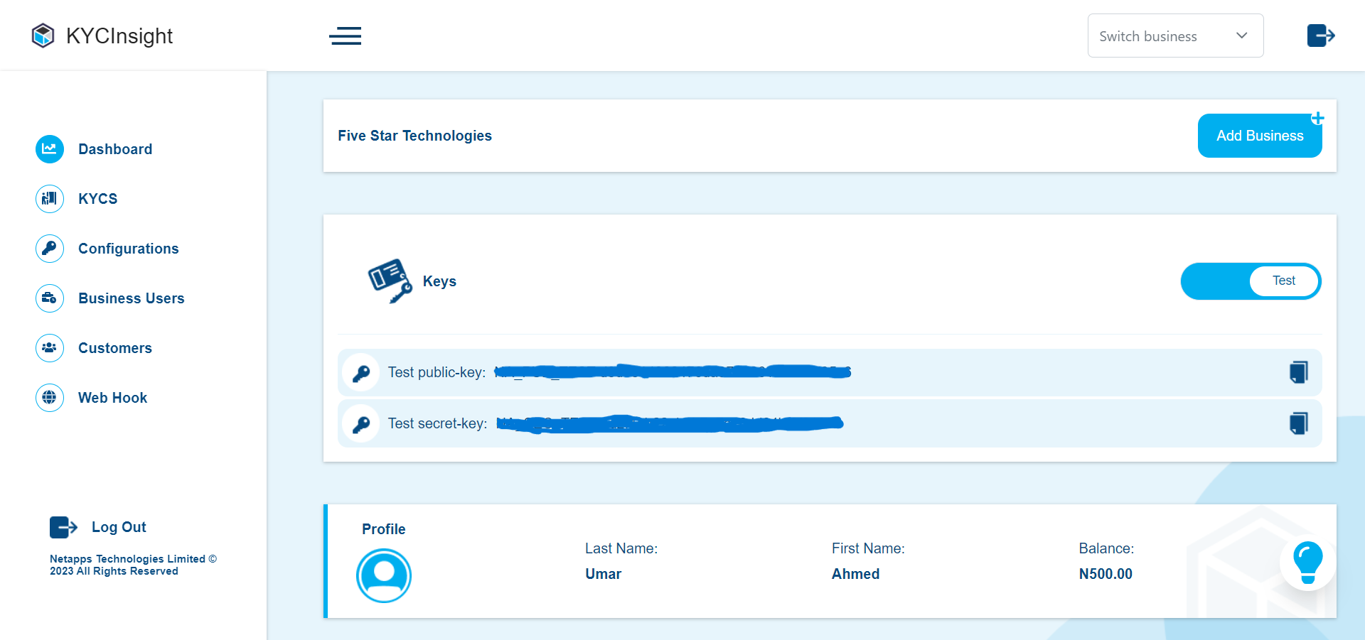 Public key: This is the key you'll employ in "public" circumstances, such as front-end JavaScript code (e.g. KYCInsight Integration).