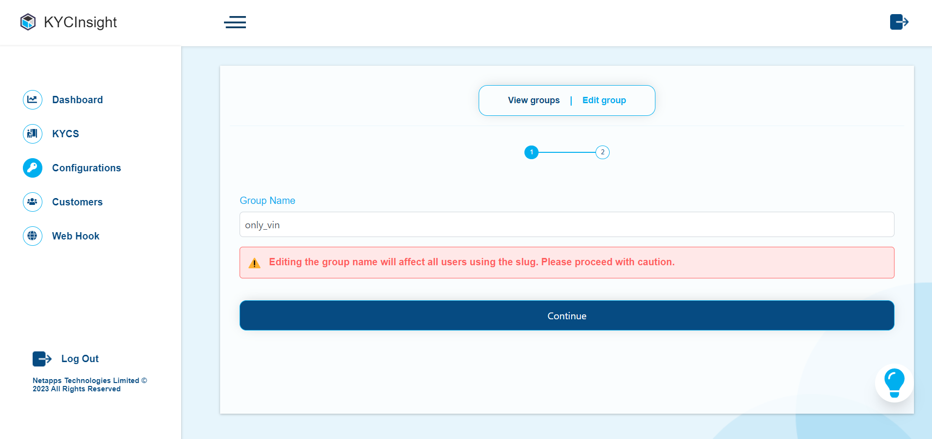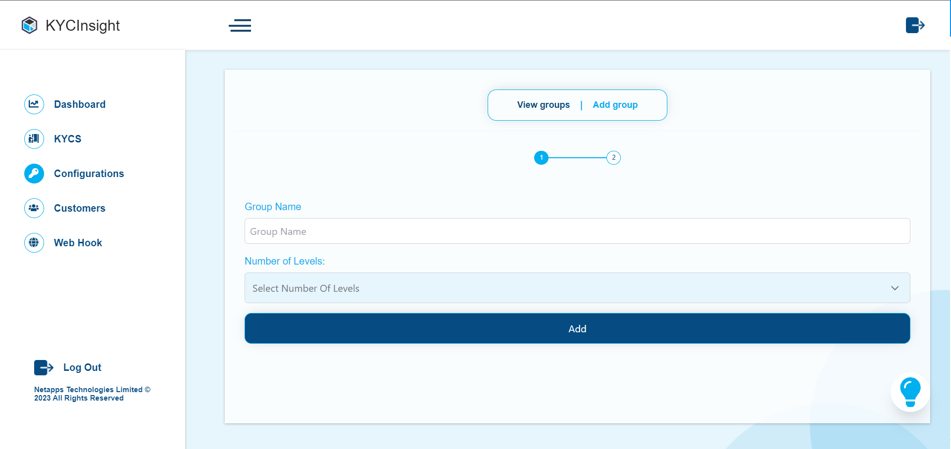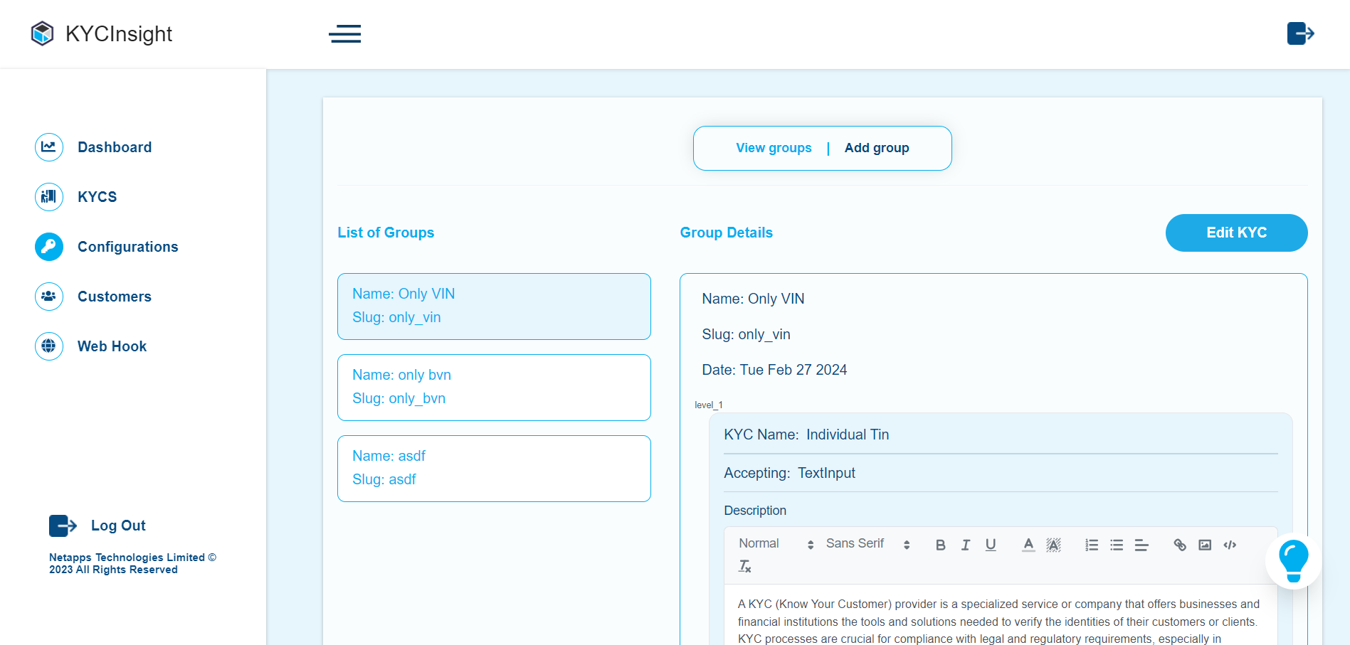 Configuration allows you to organize your KYCs into groups and to also view the various KYC groups you have on the platform. The KYC grouping allows you to categorize your KYC based on the KYC criteria. These groups help you apply appropriate levels of due diligence and monitoring based on the perceived risk associated with each group.