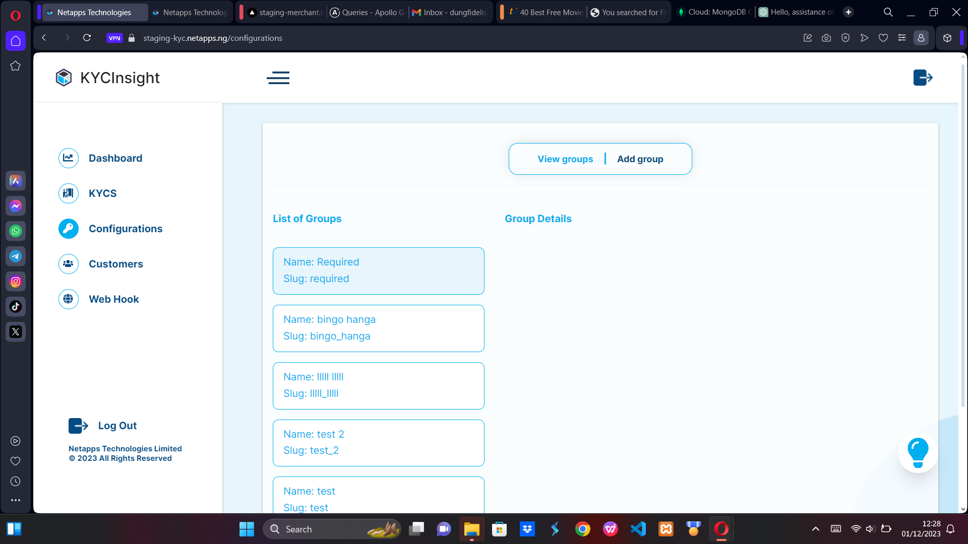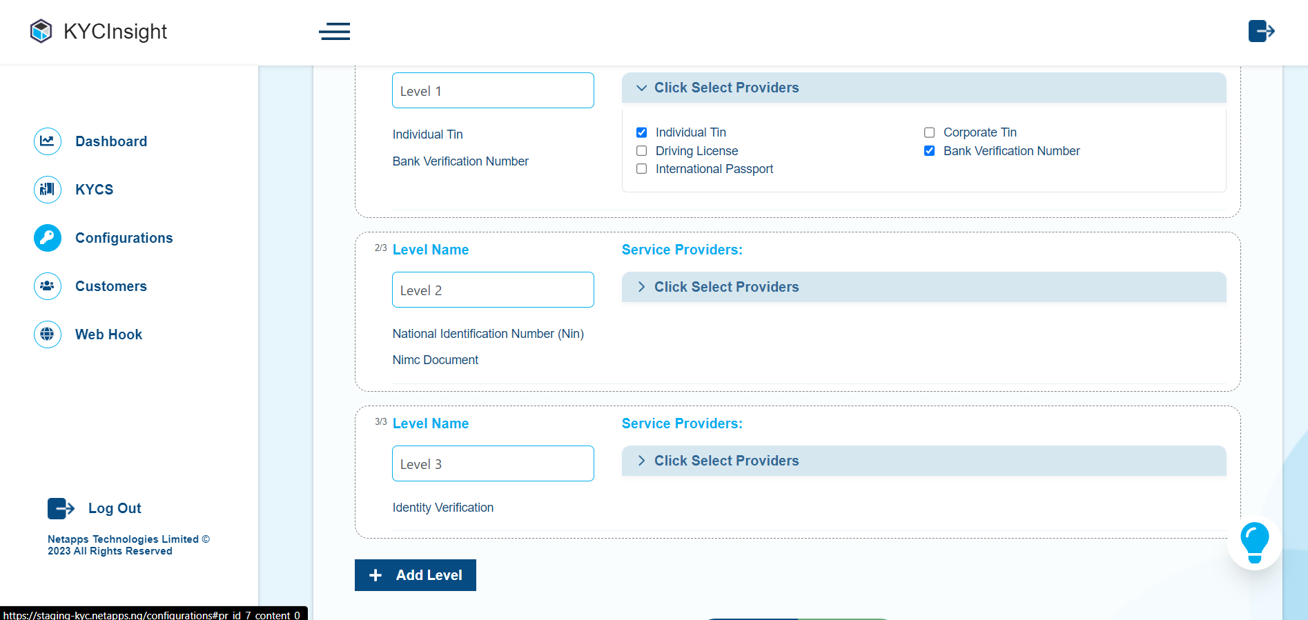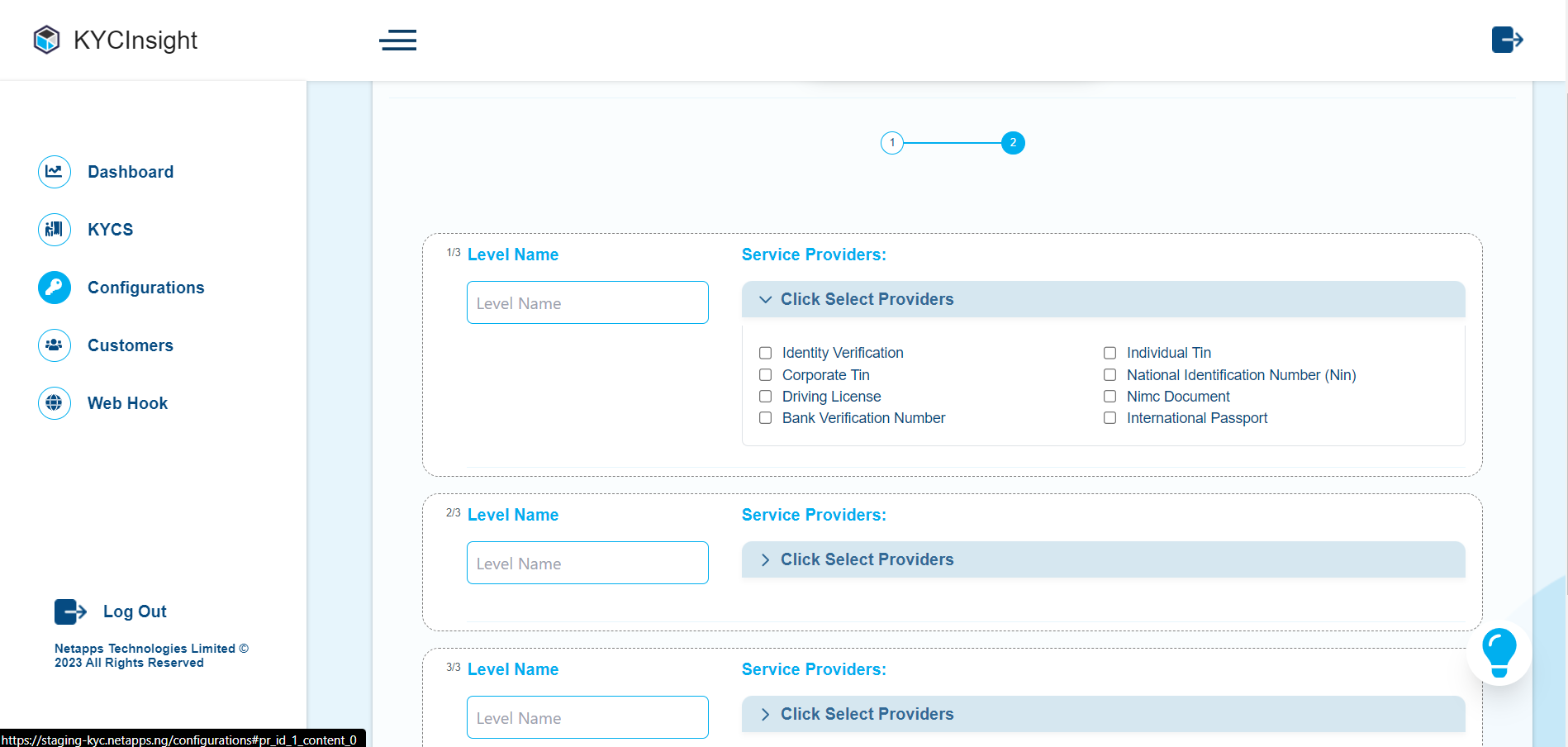 Configuration allows you to organize your KYCs into groups and to also view the various KYC groups you have on the platform. The KYC grouping allows you to categorize your KYC based on the KYC criteria. These groups help you apply appropriate levels of due diligence and monitoring based on the perceived risk associated with each group.