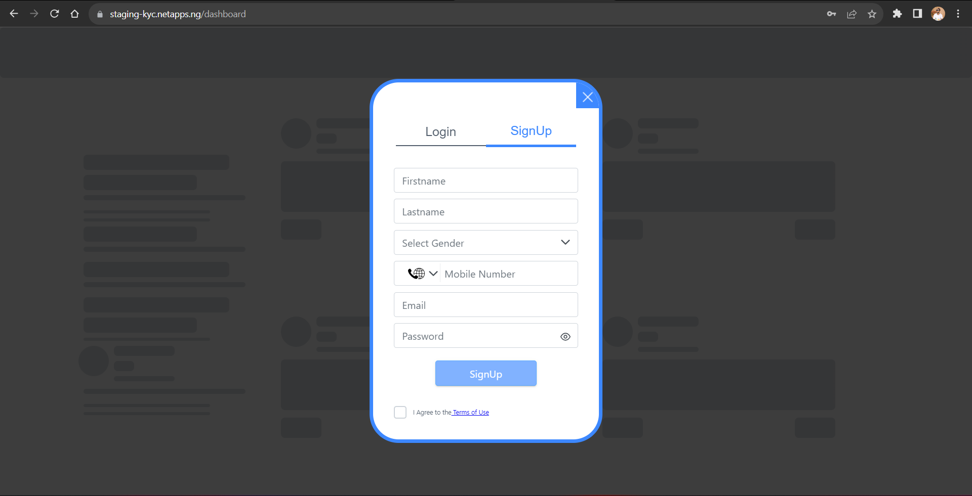 - Enter your First Name, Last Name, select your Gender, your Phone Number, Email Address, create a Password and check the I Agree to the Terms of Use.