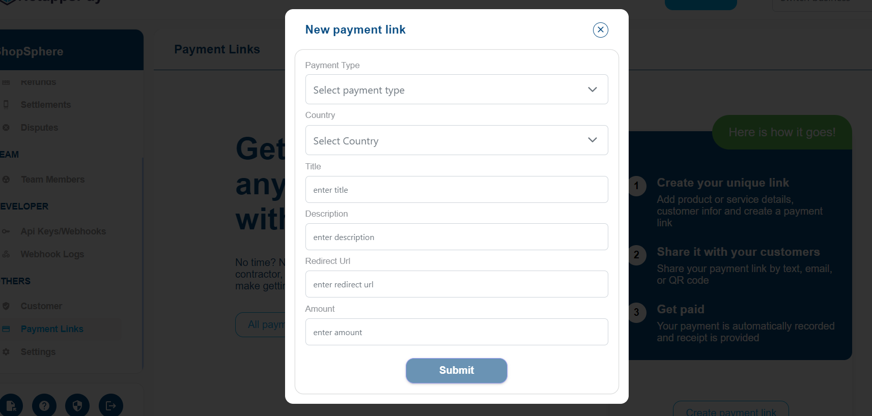 Generate payment link and share with customers to facilitate payments easily. Share your payment link by text, email, or QR code. To create create payment, do the following: