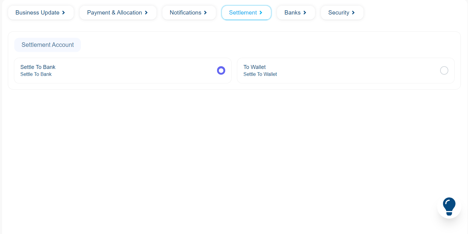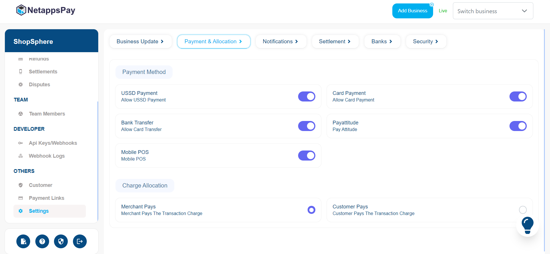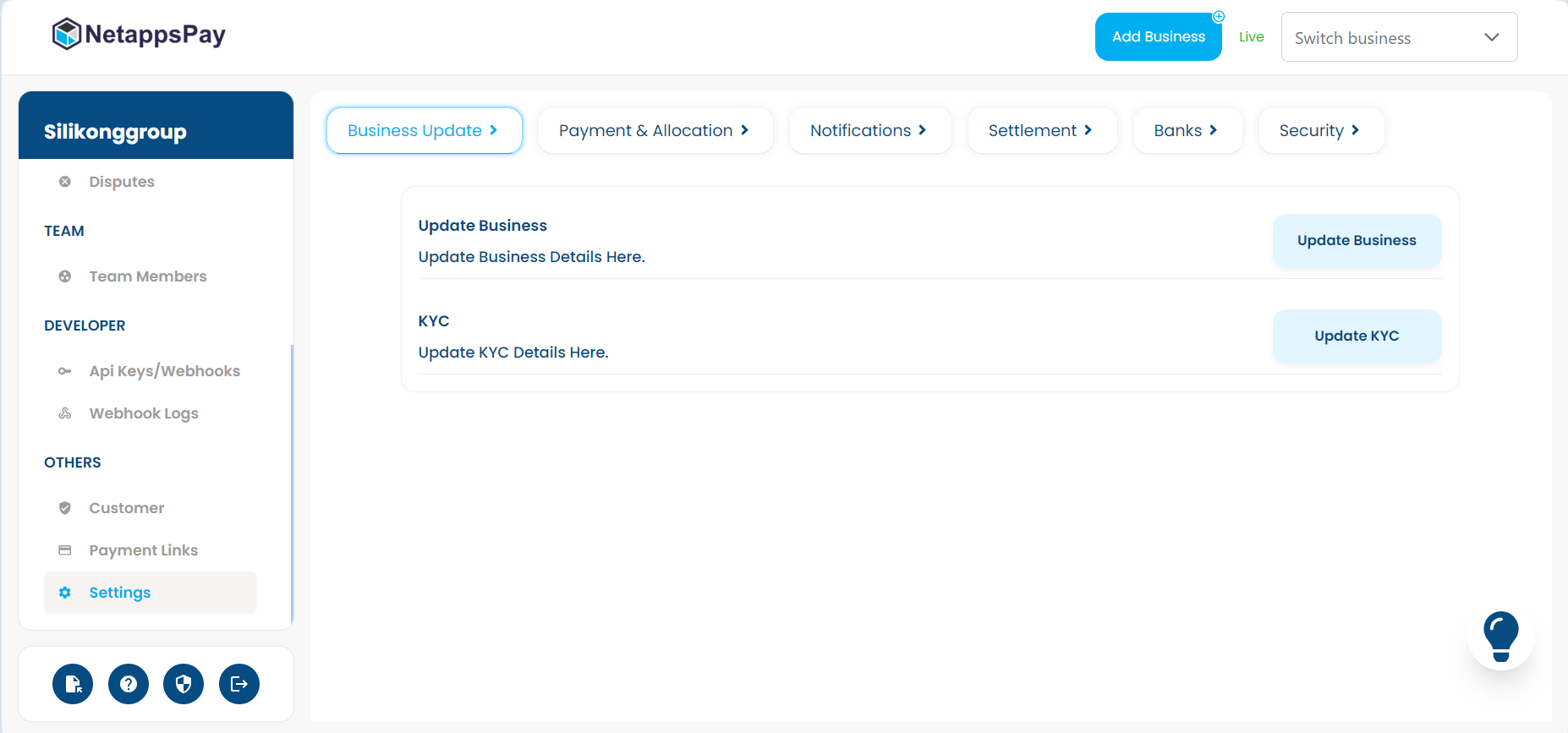 The settings menu provides merchants with a centralized location to configure and customize various aspects of their account and payment gateway integration. Merchants perform business updates, configure payment and allocations, configure notification settings, settlements, update bank details and security settings.