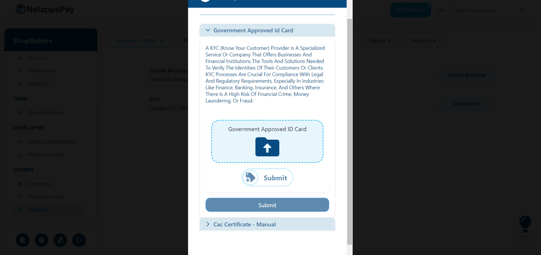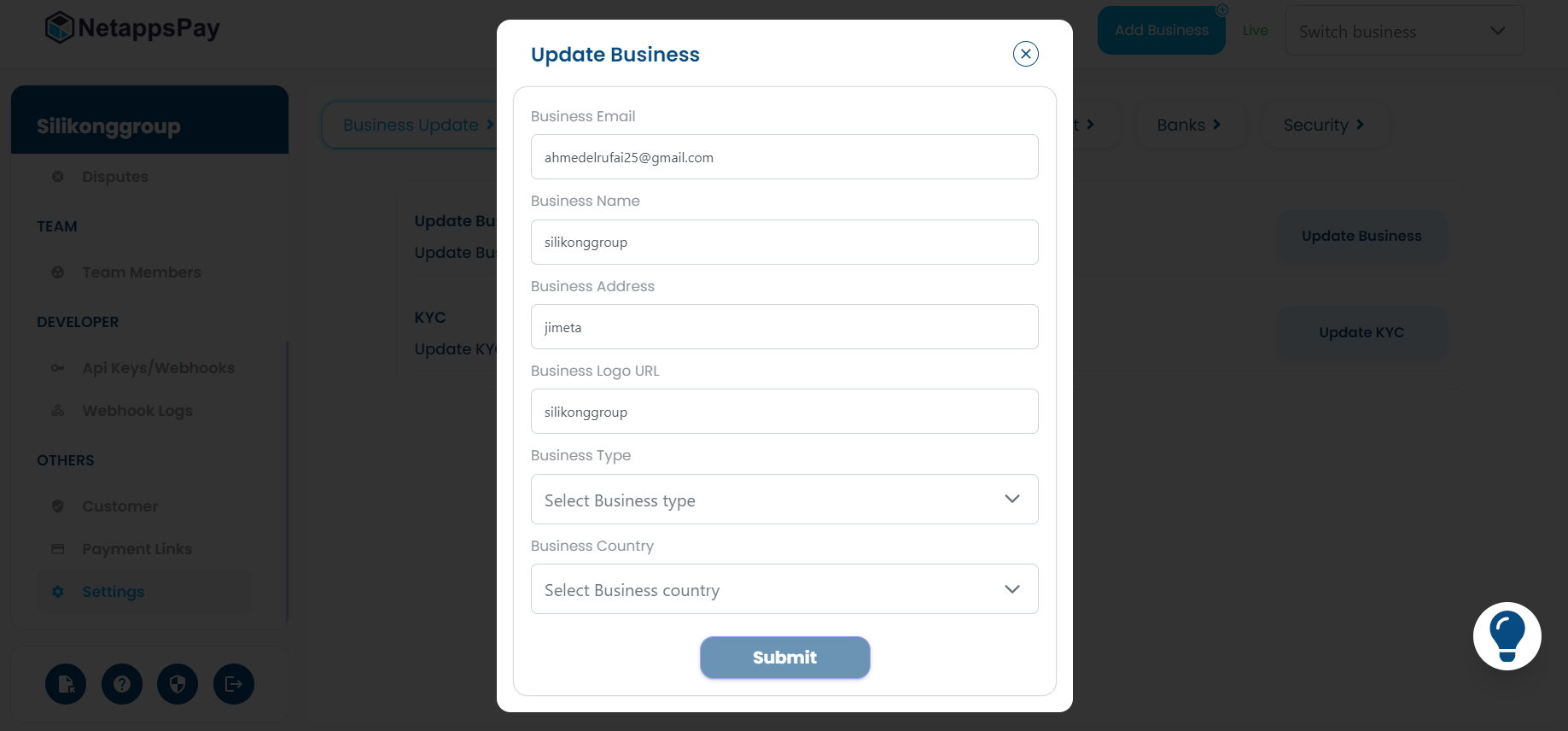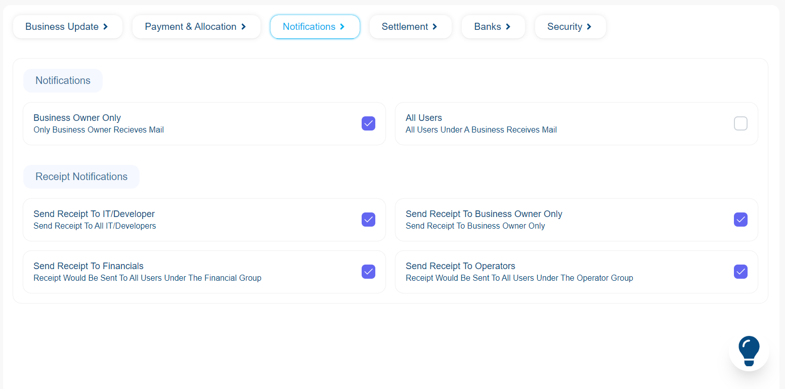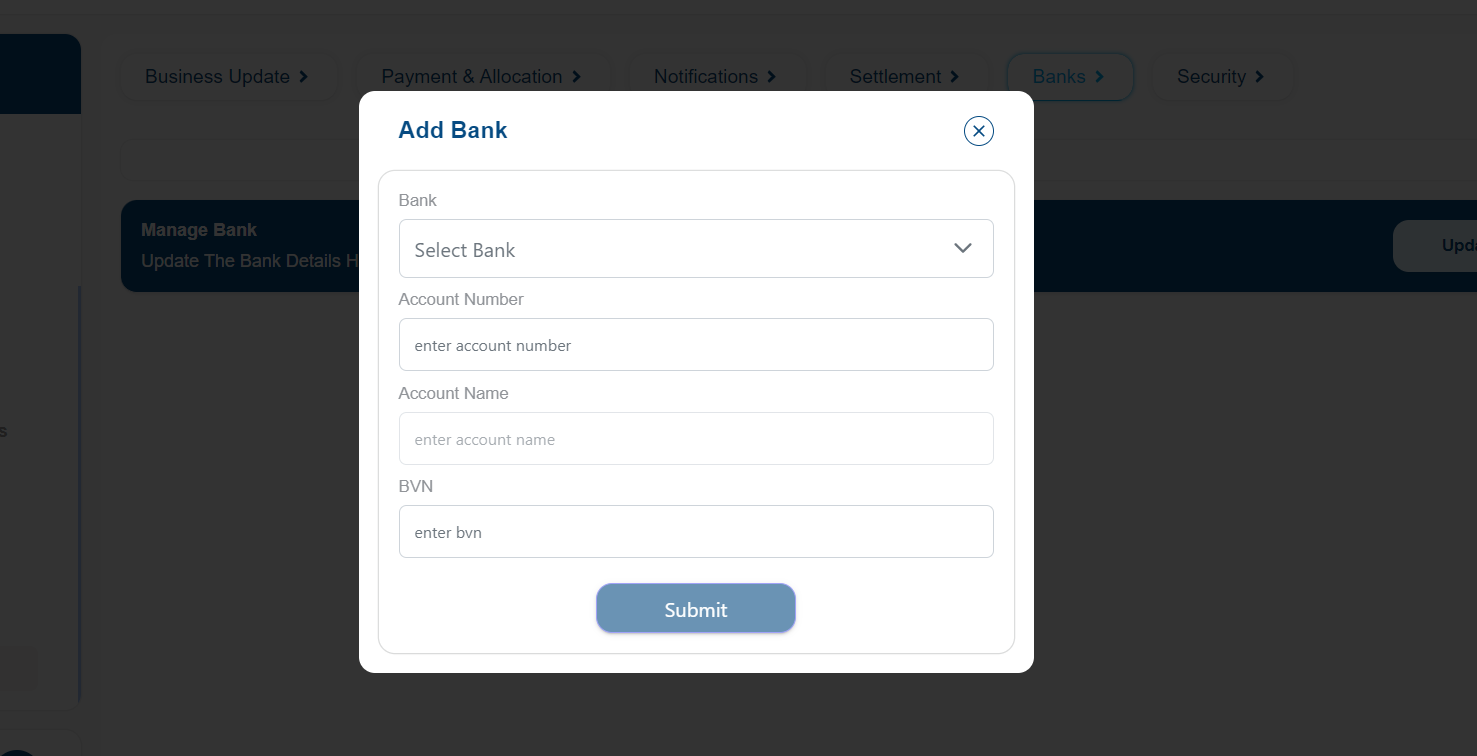 The settings menu provides merchants with a centralized location to configure and customize various aspects of their account and payment gateway integration. Merchants perform business updates, configure payment and allocations, configure notification settings, settlements, update bank details and security settings.