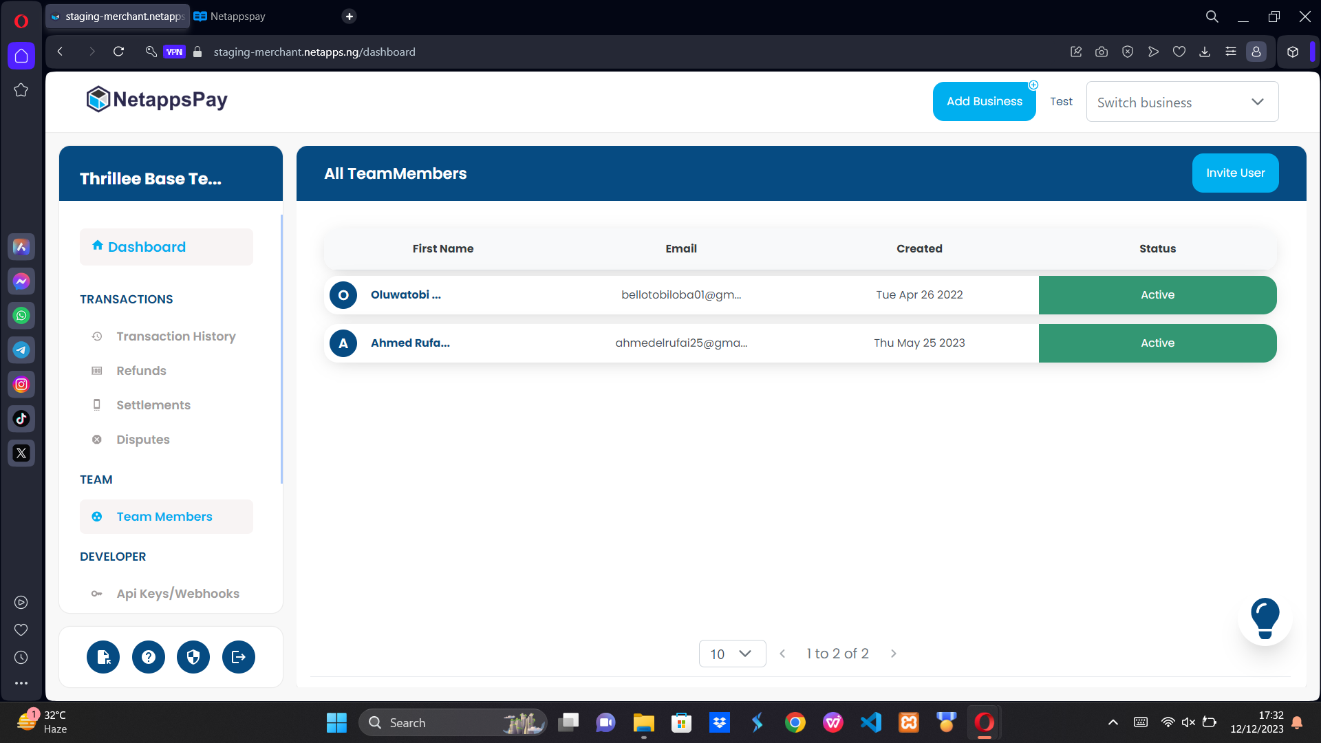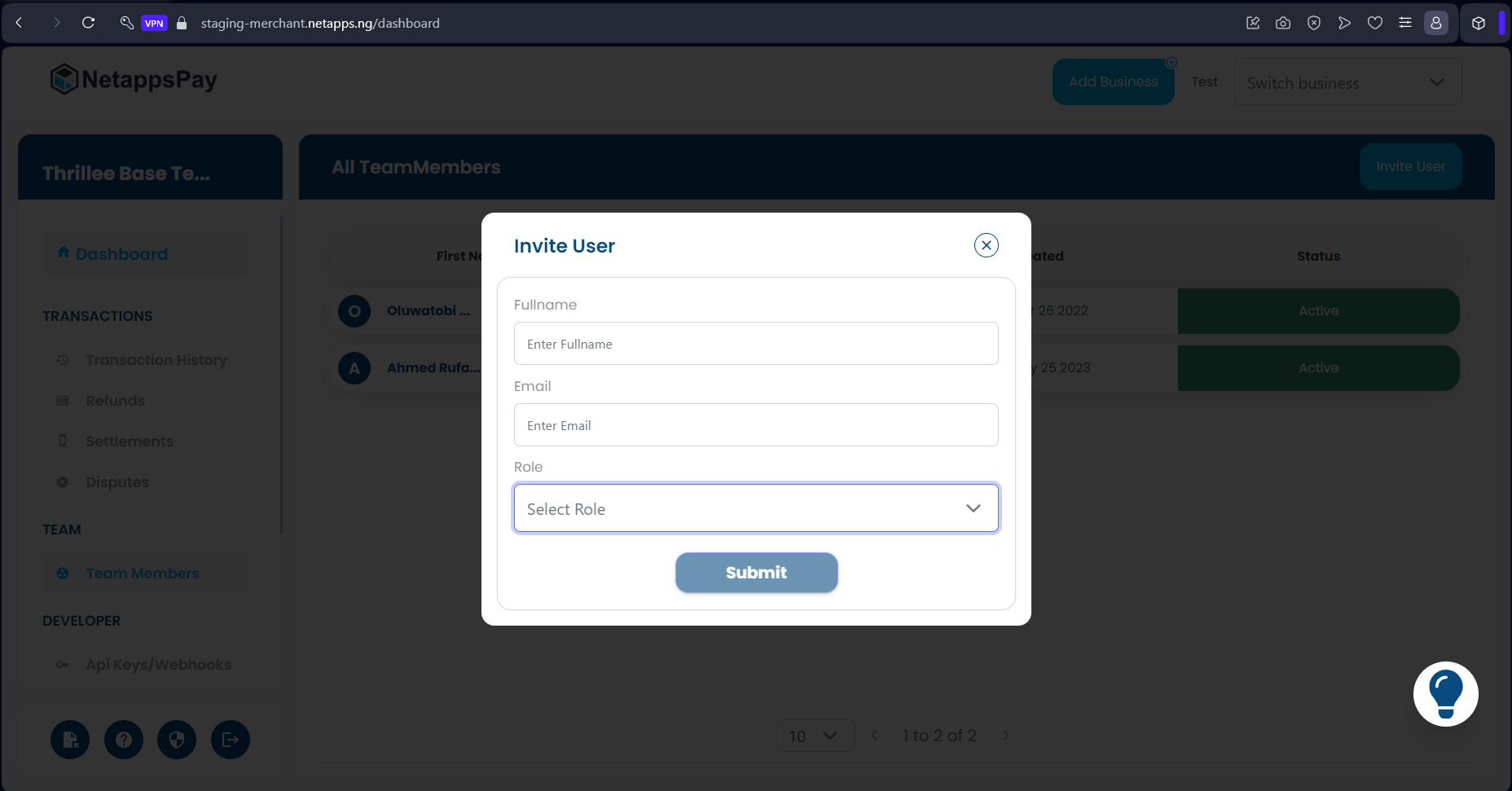 These are individuals who work together, and are responsible for developing, maintaining your payment system. They are usually professionals from various fields with different roles such as Software engineers, Database Administrators, Security Analysts, System Administrators, Network Administrators etc. Click the team members menu to display the screen bellow: